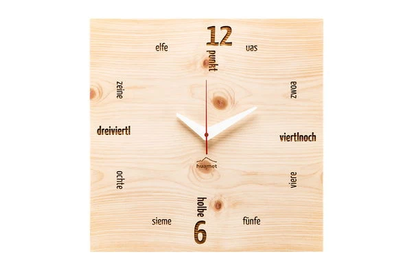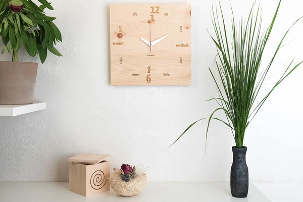 Tout d’abord, l’horloge murale design ‘Kultuhr (swiss pine angular)’ de huamet attire l’attention par sa forme angulaire. Lorsque vous regardez le cadran de l’horloge aux aiguilles blanches, vous découvrez une autre particularité : les noms des heures en dialecte du Tyrol du Sud, l’Ultnerisch, sont fraisés dans le bois de pin de pierre suisse beige, qui provient de la sylviculture durable. Dans votre salon, l’horloge murale artisanale sans tic-tac crée une atmosphère rustique qui vous invite à vous sentir bien.