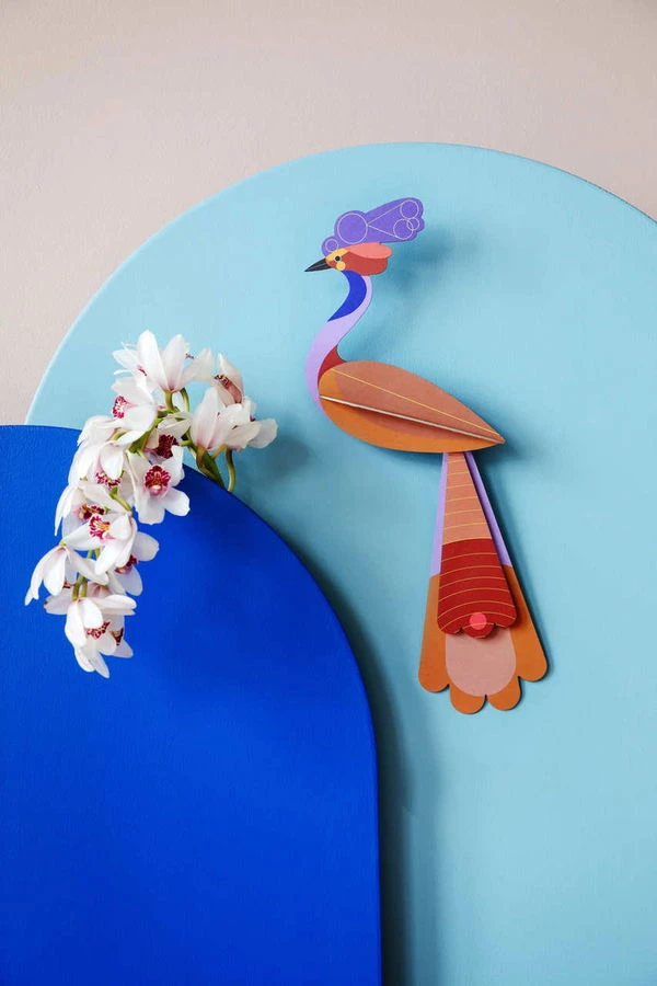 La sculpture murale en carton ‘Savu’ est fabriquée à partir de carton recyclé et les intéressantes nuances de violet et d’orange ont été appliquées avec de la peinture végétale. De plus, elle se combine facilement avec d’autres décorations murales 3D. Vous pouvez donc être sûr que non seulement vous ne regretterez pas d’avoir fait une place à cet oiseau à assembler soi-même dans votre salle à manger, mais que vous penserez déjà à qui sera son prochain ami en 3D.
