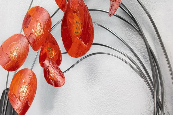 La décoration murale en métal ‘Coquelicots fleuris’ a été soudée, pliée, poncée et polie à la main par notre artiste. La décoration murale tridimensionnelle en métal brille dans des couleurs changeantes et attire à coup sûr l’attention sur votre mur.