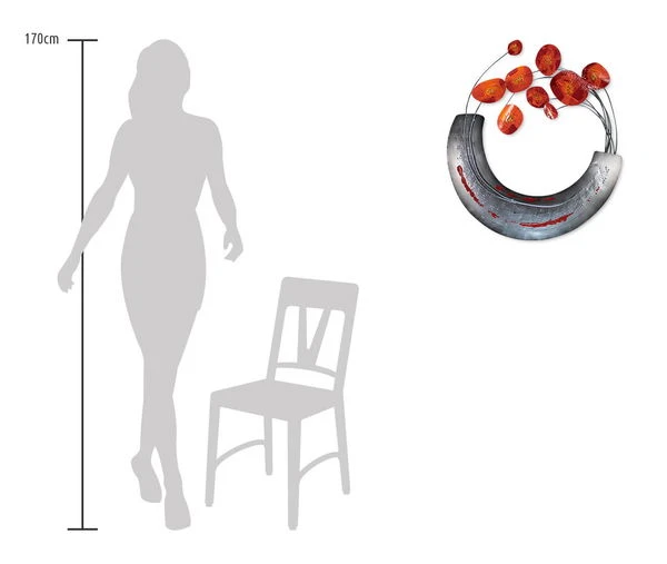 L’imposant tableau en métal ‘Coquelicots fleuris’ exhibe sa splendeur dans un vase XXL en forme de demi-lune. Les tiges de métal se plient légèrement au vent du printemps et les coquelicots baissent leurs corolles. Les fleurs brillent d’un rouge vif impressionnent grâce à la combinaison de leurs force et de leurs délicatesse. La beauté florale aux reflets dorés apporte de la fraîcheur dans votre salon et enchante par son charme certain !