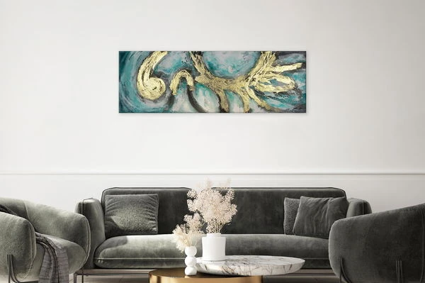 Un timide effet d’aspiration se dégage du tableau acrylique ‘Enigma’, dont les dégradés de couleurs s’entremêlent à la manière de l’aquarelle et forment des tons mélangés harmonieux. La composition abstraite dans les tons turquoise et blanc est ornée de coups de pinceau dorés et confère à votre salle à manger une élégance incomparable. Découvrez la fascination de ‘Enigma’, le tableau acrylique peint à la main par l’artiste Kenneth Zeng !
