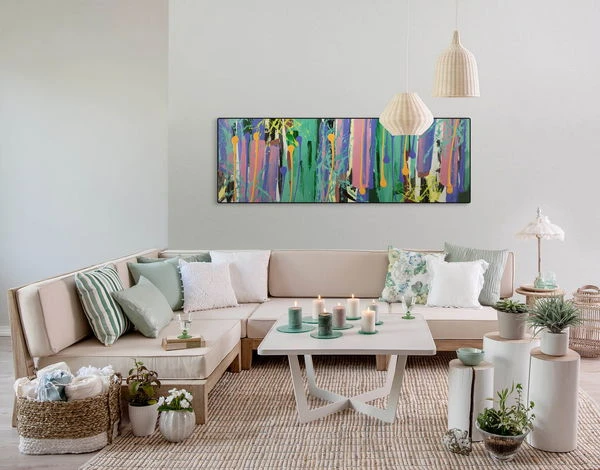 Apportez une bouffée d’air frais dans votre maison ! Avec cette peinture acrylique sélectionnée, un’Kunterbunte Ära’ commence dans votre salon, qui déborde de joie et de joie de vivre. Les coups de pinceau peints à la main et les éclaboussures de peinture aux couleurs splendides ont un effet vif et transportent une dynamique qui est immédiatement transférée à vos invités. Créez habilement une exubérance rebondissante dans votre salon.