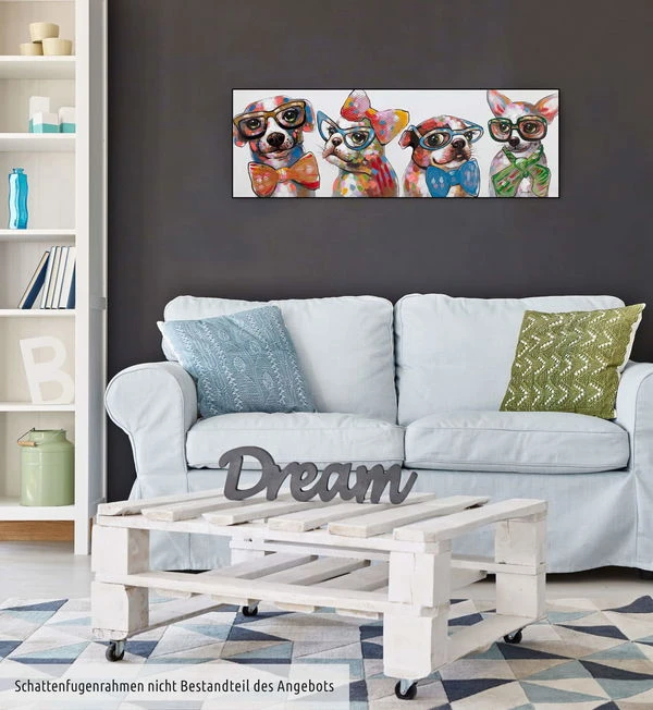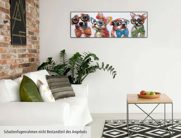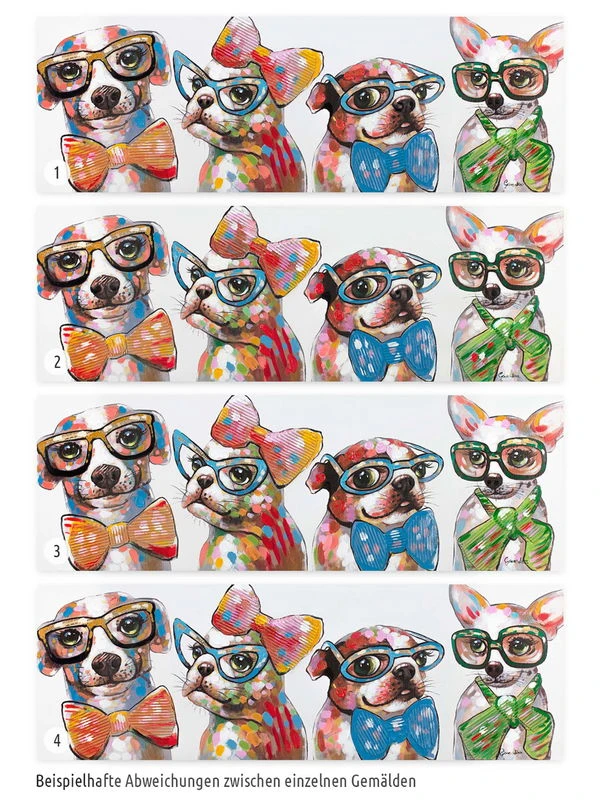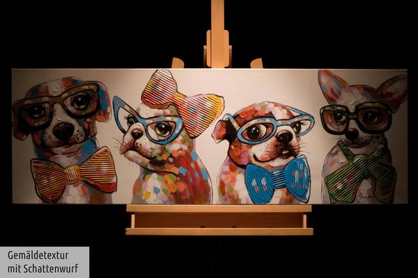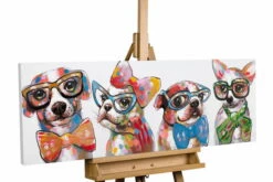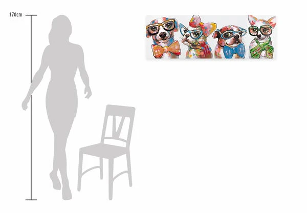 Les quatre ‘Fashionistas’ ne peuvent être empêchés de prouver leur style par des banalités telles que l’espèce ou la race. Ces quatre chiens ont de grands projets, c’est sûr. Chacune d’entre elles avec des lunettes à monture en corne et un nœud papillon à la mode, elles posent pour le tableau. L’image acrylique peinte à la main est conservée dans des tons de rouge chaud, ce qui permet d’obtenir un contraste réussi avec les tons de bleu clair. C’est tout simplement un plaisir de regarder ces quatre chiens branchés. Sécurisez cette source de bonheur colorée et mettez un accent amusant dans votre salon.