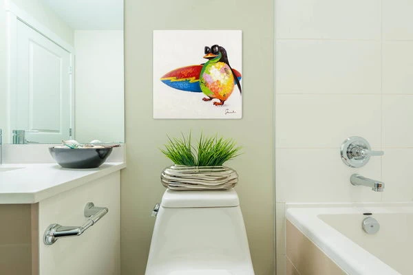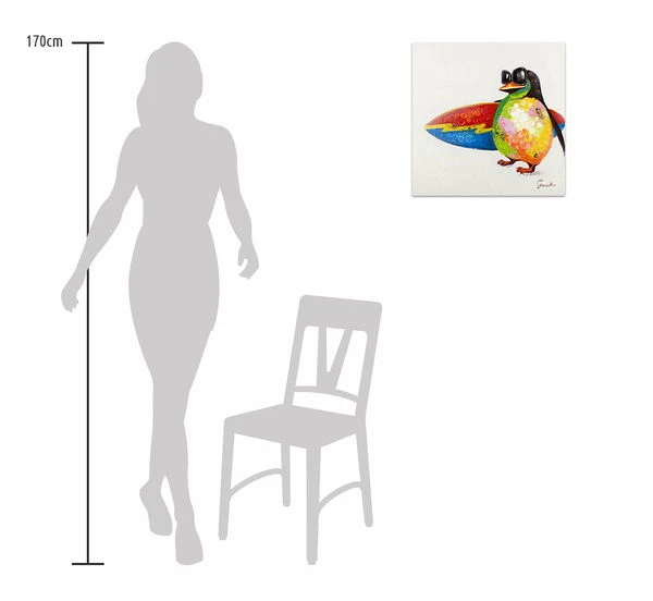 En contemplant la peinture faite à l’acrylique ‘Le Paradis du Surfeur’, votre cœur se réchauffera instantanément. Elle représente un petit pingouin haut en couleur portant des lunettes de soleil et tenant fièrement sa planche de surf dans les mains, regardant au loin la mer. Avec cette peinture à l’acrylique de KunstLoft, vous mettrez une agréable ambiance dans votre salon. Cette œuvre multicolore convient particulièrement bien à une chambre d’enfant avec ses ornements dorés et argentés. Elle saura également faire apparaitre un sourire sur votre visage et ceux de vos invités jour après jour.