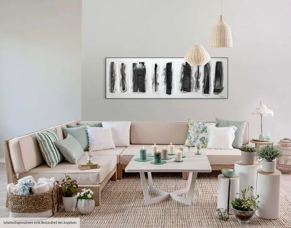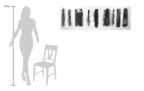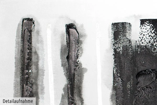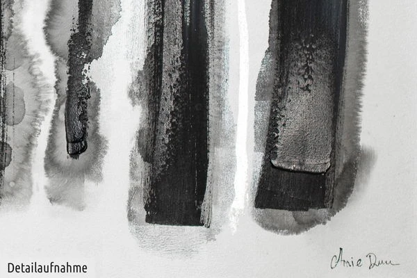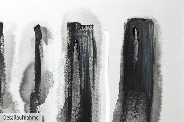 Le contraste puissant du noir profond sur le fond blanc fait ressortir cette peinture abstraite aux reflets argentés. Les ‘Pistes dans la neige’ énigmatiques donnent l’impression que l’artiste a effacé la peinture blanche comme s’il s’agissait de neige pour révéler la terre sombre en dessous. Créez une atmosphère hivernale paisible dans votre salon avec ce tableau acrylique peint à la main.