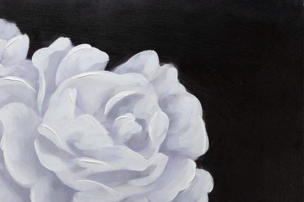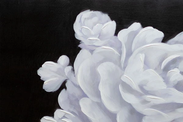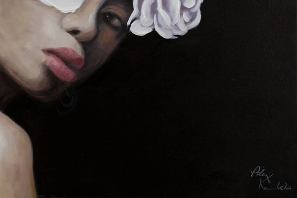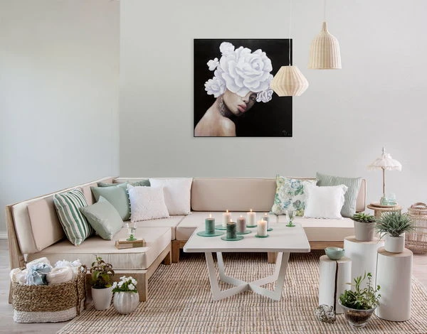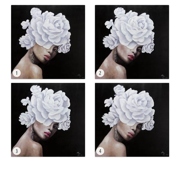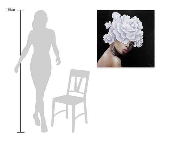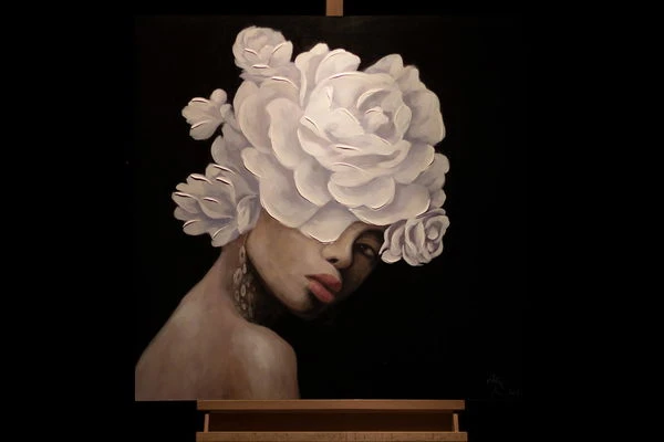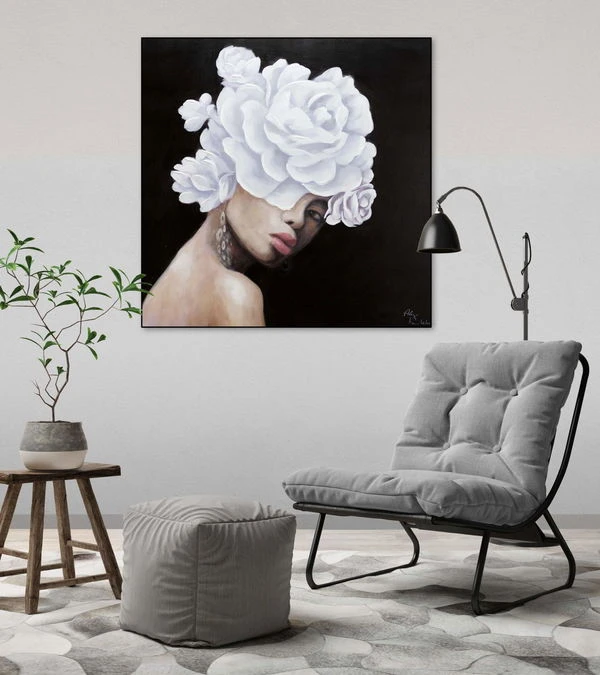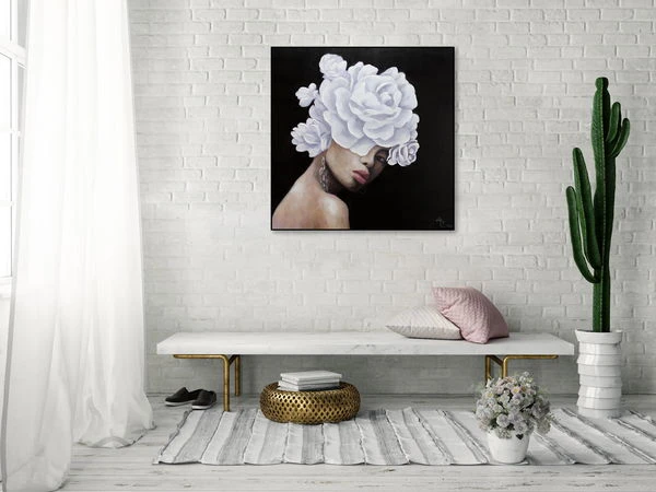 Digne et de profil trois-quarts, le ‘Queen of Roses’ fait face au spectateur sur un fond noir. Elle porte une couronne de fleurs blanches, qui est conçue dans une application de couleur riche en structure et donne à la peinture acrylique une élégance extraordinaire. La peau de la femme est sans défaut et modelée par l’artiste dans des tons abstraits de rose, ce qui donne à l’image peinte à la main un caractère réaliste qui impressionne dans n’importe quelle pièce.
