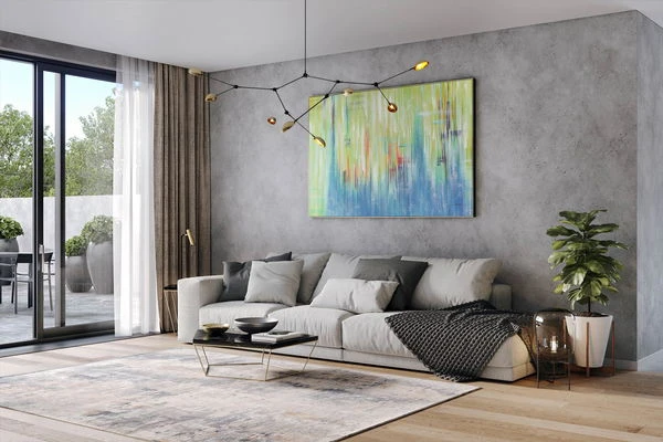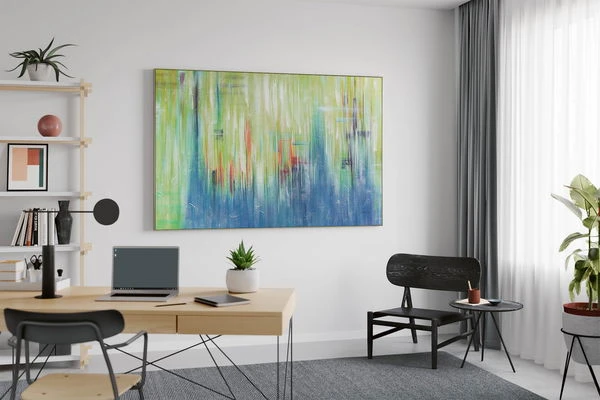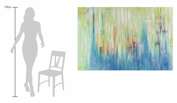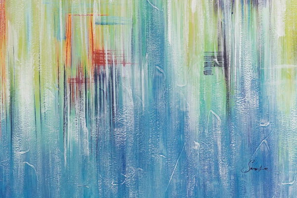 Une expérience avec des irisations turquoises et jaunes rappelle le style du’batik’ sur la peinture à l’huile peinte à la main de l’artiste Sony Lim. Dans sa représentation de la peinture détachée, Lim utilise les couleurs de manière passive et laisse leur coloration se dissoudre aux points de transition en nuances artistiques mixtes. Un tableau impressionnant en grand format !