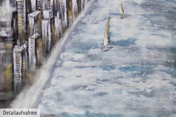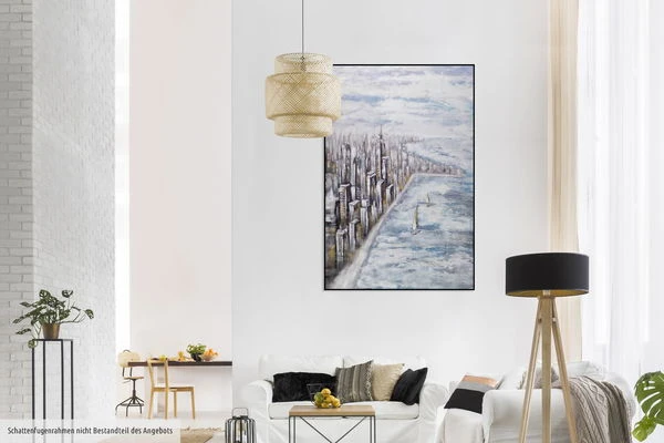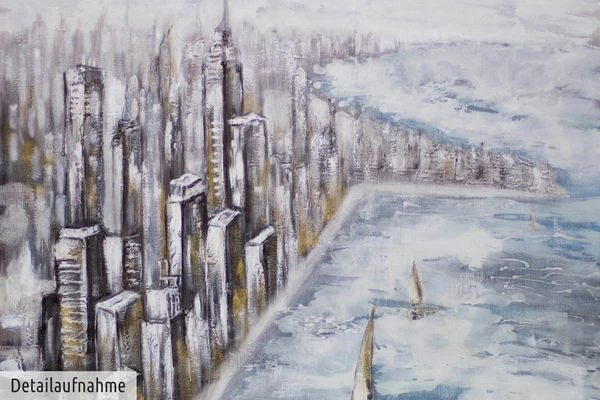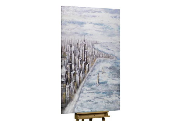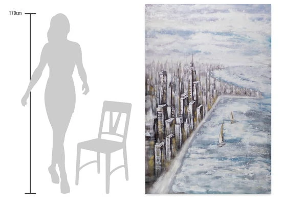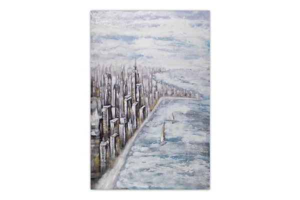 L’artiste Sony Lim vous emmène dans un vol panoramique au-dessus d’une ville balnéaire dans sa peinture à l’huile grand format ‘Coastlined’ en gris palpable. Alors que la vie ne s’arrête jamais dans les gratte-ciel, les voiliers sur l’eau cherchent la paix. Ce contraste peint à la main est le symbole des deux côtés de la modernité urbaine.