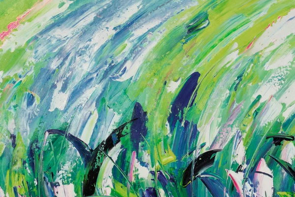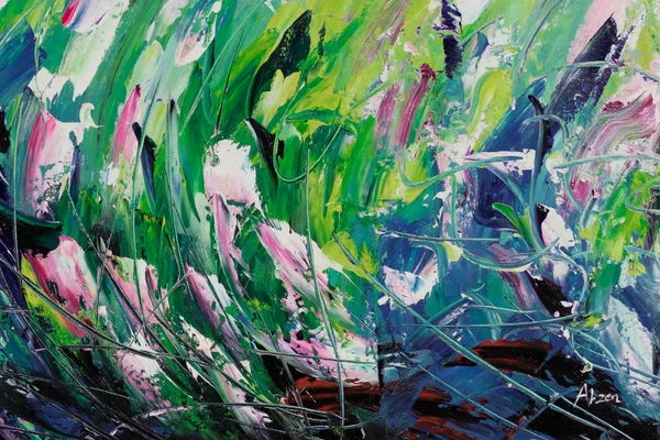 Des formes vertes et bleues émergent du sol terreux du paysage abstrait de la peinture à l’huile peinte à la main’Escape from the Background’ de l’artiste Arzen. Dans le style de l’impressionnisme, l’artiste s’immerge dans un monde coloré de couleurs, enchantant le spectateur par l’application pâteuse de la couleur et la puissante complexité de la grande peinture.