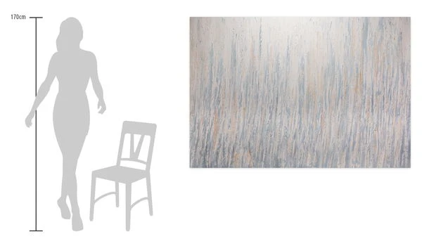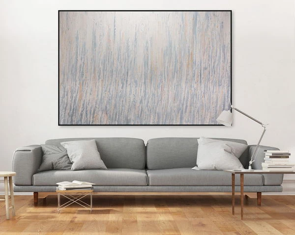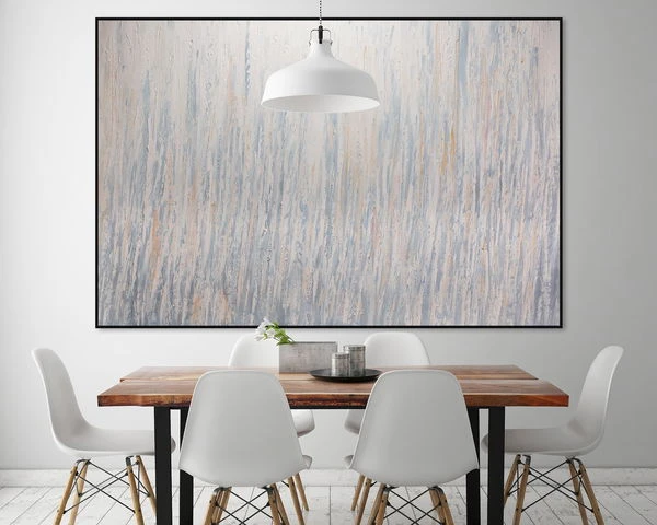 L’artiste Donny Huang a réalisé un véritable »coup de génie » dans l’art de l’abstraction avec ce tableau peint à la main. Comme des flammes, les pentes beiges et grises s’embrasent à partir du sol. Les couleurs chaudes se fondent sur la grande peinture à l’huile. Huang illustre le scintillement des braises avec des effets pâteux.