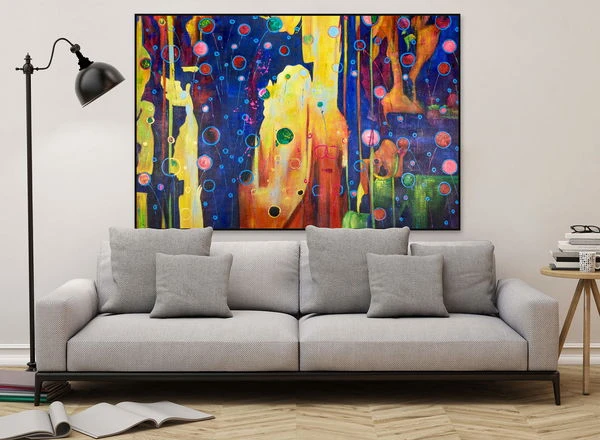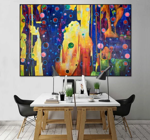 La peinture à l’huile grand format ‘Positive Impacts’ a été consciencieusement réalisée à la main.