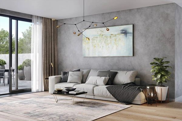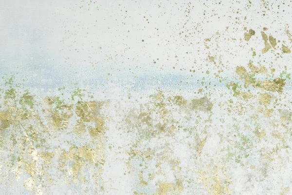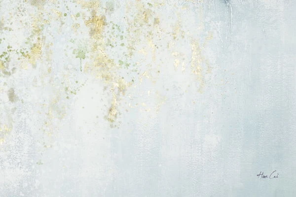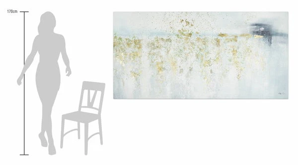 De sublimes fontaines au lustre doré éblouissant dominent la toile grand format en beige et gris, entourée d’un ‘Prächtiger Schein’ dans une grâce peinte à la main. L’artiste Han Cai crée une peinture à l’huile pleine d’abstraction paradisiaque, qui convainc par son design aux couleurs nobles dans une pastosité discrète et les motifs classiques.