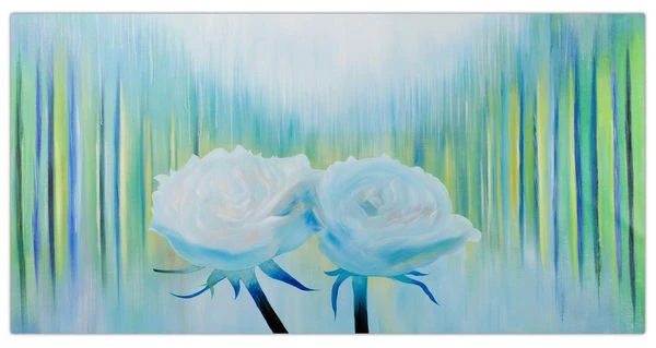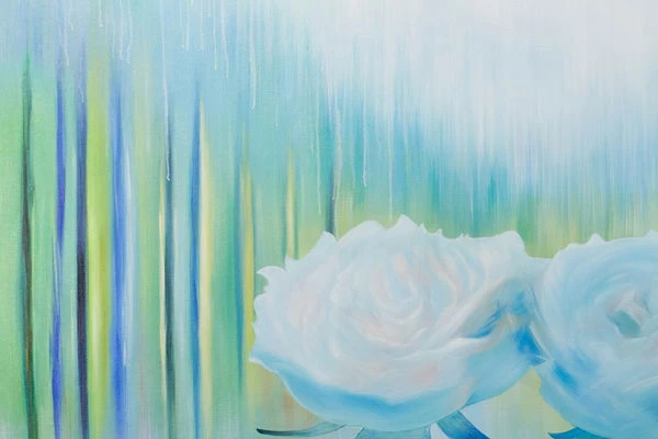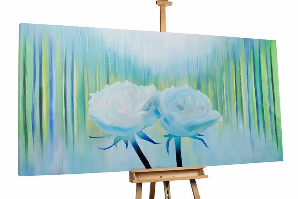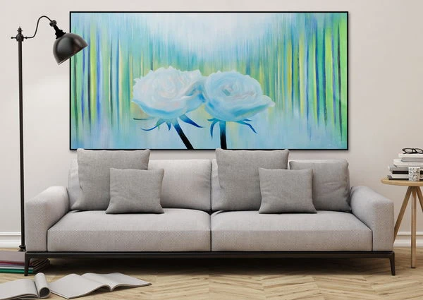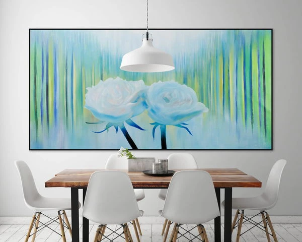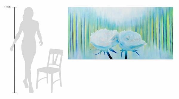 Les roses dégagent une élégance pure dans la peinture à l’huile grand format » Rosa Celeste « , qui inspire par ses fascinantes nuances de blanc et de bleu dans l’Impasto et par les jeux d’ombre et de lumière. Impressionniste en apparence, l’artiste Victor Zhen colore les fleurs peintes à la main dans des couleurs célestes – un contraste expressif.
